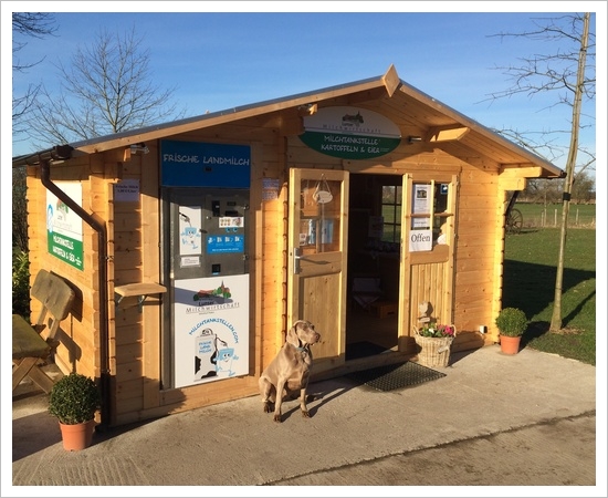 Frische Milch aus der Milchtankstelle, Kartoffeln, Eier aus dem mobilen Hühnerstall, selbstgemachte Marmeladen, Fleisch, Café zum Einkehren und vieles mehr...
