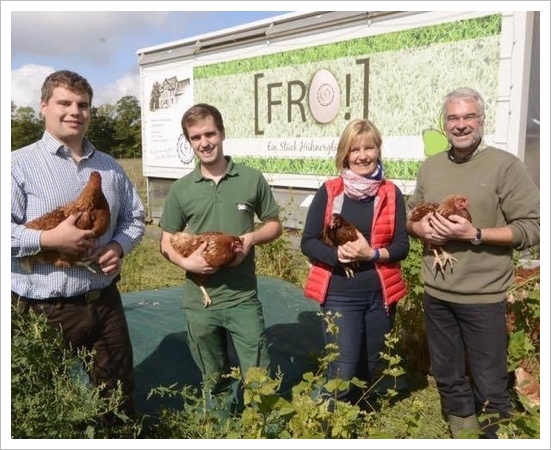 Täglich frische Eier von glücklichen freilaufenden Hennen aus dem Hühnermobil.