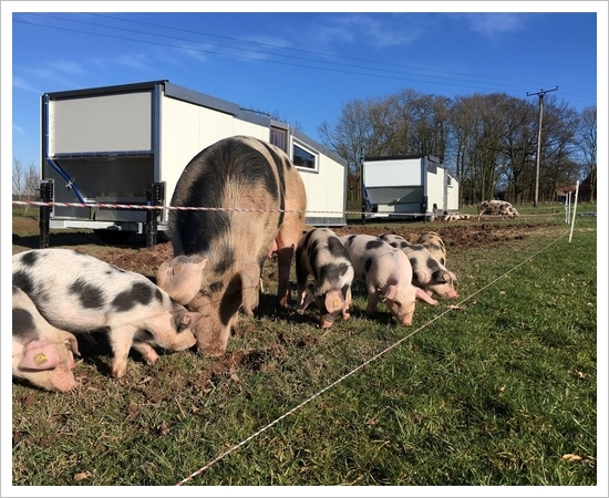 Rund um die Uhr-Selbstbedienungsladen mit Produkten des Bunten Bentheimer Schweins aus ökologischer, mobiler Auslaufhaltung. Sehenswert: die Schweine!