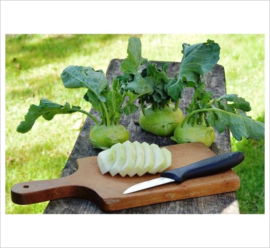 Kohlrabi putzen, in Stifte schneiden, im Wasser zugedeckt in der Mikrowelle bei 600 W etwa 12 Min. garen.
