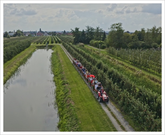Genießen Sie eine Fahrt mit unserem Obsthof Express, direkt in die Obstplantagen, von April- Oktober.