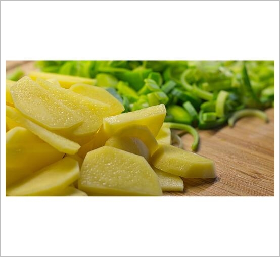 Kartoffeln schälen, 20 Min. garen, in Scheiben schneiden.