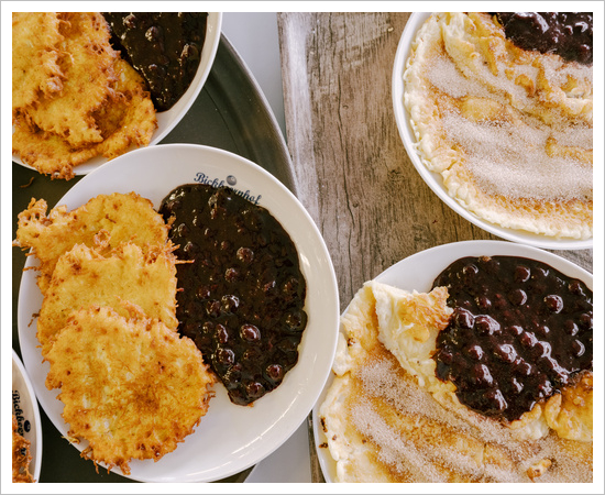 Hausgemachte Kuchen, Eis, Bickbeerwaffeln, deftige Küche: z.B. Wildbratwurst mit Pommes oder Heidelbeer-Currywurst