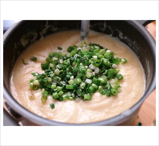 Den Lauch waschen, putzen und fein schneiden.