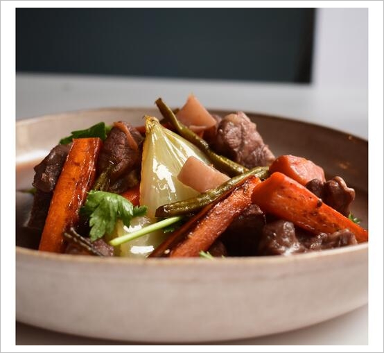Die Zwiebeln in große Streifen schneiden, zum Fleisch geben und bräunen lassen.